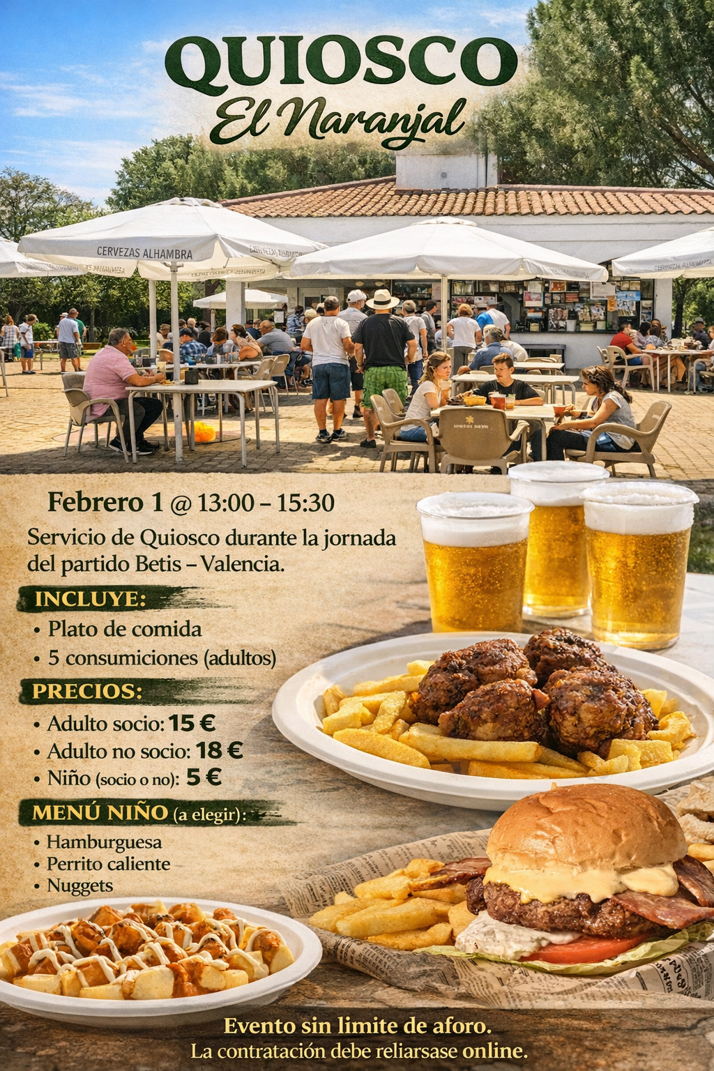 Quiosco el Naranjal. Parque del Alamillo. Adulto socio: 15 € • Adulto no socio: 18 € • Niño (socio o no): 5 €